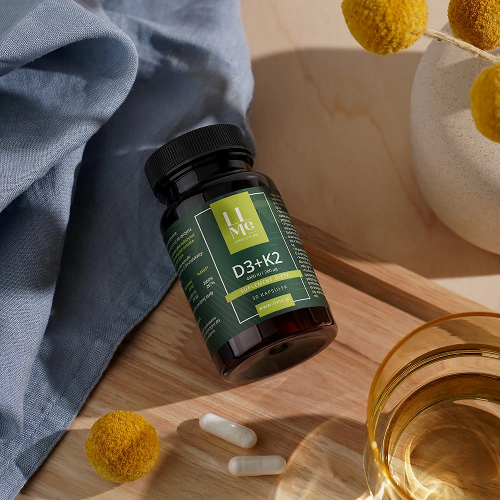 Witaminy D3 i K2 działają synergicznie - witamina D3 zwiększa wchłanianie wapnia z przewodu pokarmowego, a witamina K2 pomaga kierować wapń do kości i zębów, zapobiegając jego odkładaniu się w tkankach miękkich i naczyniach krwionośnych.